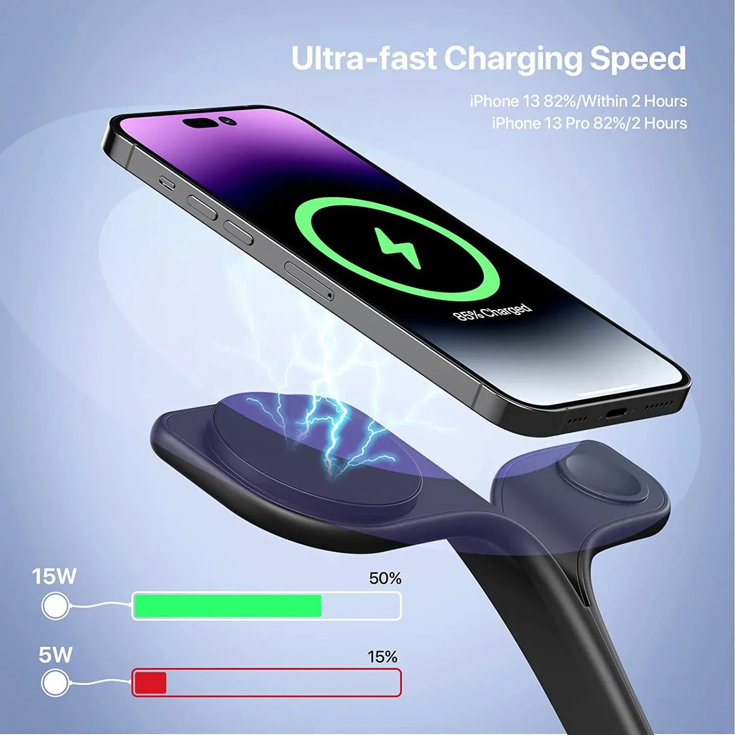 ⚡ 15W Fast Magnetic Output: Up to 15W for MagSafe-compatible iPhones; AirPods (wireless) up to 5W; Apple Watch standard 3W output.